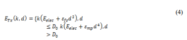 Where Eelec is the ambient energy dissipation in relaying node Efs and Emp circuitry, and are the path loss coefficients for line of sight propagation and multi path propagation respectively.