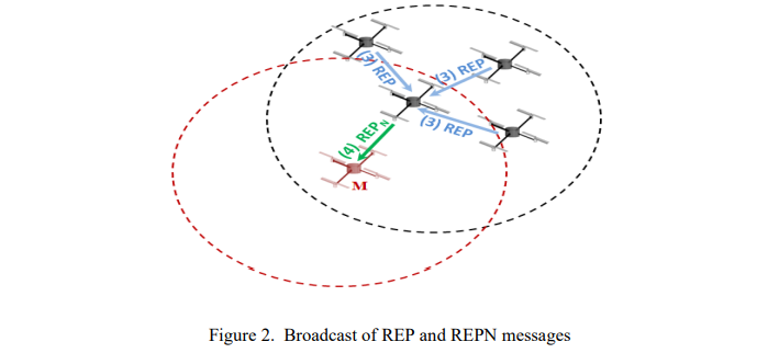 his step allows the initiator node M (the ground station can play the role of the initiating node M) to detect its 1-hop and 2-hop neighbors, and also allows calculating the distances between the UAVs. To this end, the initiator node M broadcasts a message of type request (REQ) to all its neighbors. Each neighbor node (1-hop), upon receiving this message, broadcasts it to all its neighbors (cf. Figure 1).