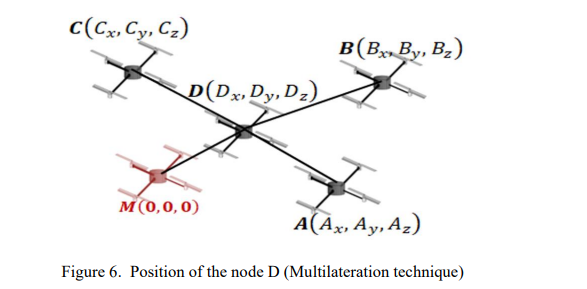 After determining the local positioning system, each neighbor of the nodes “M”, “A”, “B and “C (for example, node D) must calculate its position using the positions of the latter, and considering the distance that separates it from them, by applying the multilateration technique (cf. Figure 6). So, it suffices to solve the following system of equations: