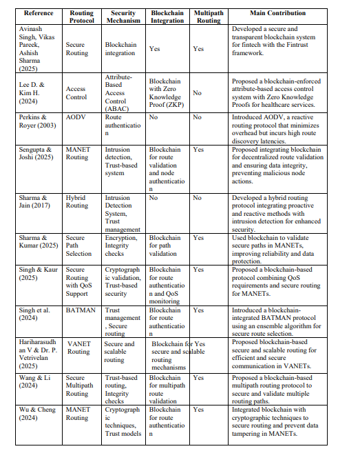 · Blockchain-based Route Authentication: Suggests a tamper – resistance strategy that implements route authentication through blockchain in a situation where there is a multipath routing protocol to provide security to the network.
