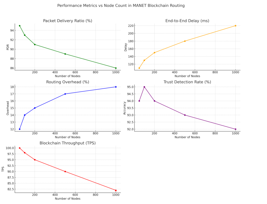 · Medium Overhead and Delay: As the routing overhead and delay are increased with respect to blockchain consensus processes, the framework does have better performance compared to other traditional routing protocols since the routing is secure and attack cannot significantly impact the performance due to the framework. As Sharma et al. (2025) demonstrate, the extra overhead is a reasonable compromise that is accepted in order to create a safe and stable communication in MANETs.