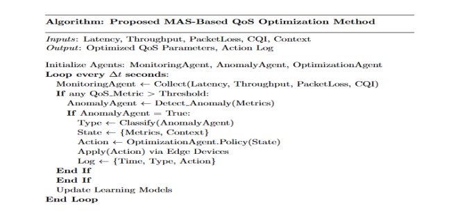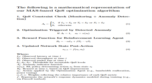 To formalize the decision-making process of the Multi-Agent System (MAS), we model the QoS optimization problem as a Markov Decision Process (MDP). This formulation captures how agents observe the network state, evaluate conditions based on predefined QoS thresholds, and apply corrective actions through a reinforcement learning framework. The mathematical representation provided below defines the key components of the system: anomaly detection logic, action policy selection, reward evaluation, and network state transition. Each equation reflects the logical flow from performance monitoring to autonomous optimization, grounded in real-time feedback from the Firecell testbed. This abstraction enables rigorous analysis, scalability, and adaptation to dynamic IIoT conditions.To operationalize the mathematical framework described above, we present the corresponding algorithmic flow for the proposed MAS-based QoS optimization method. This procedure captures the agent interactions, anomaly detection logic, and reinforcement learning-driven decision-making loop in a structured and repeatable format.