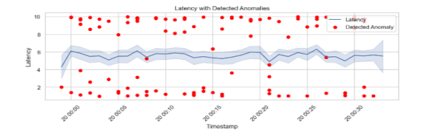 The Isolation Forest model trained on normal network data identified several abnormal intervals corresponding to latency spikes and minor throughput drops. Figure 5 presents the anomaly scores over time, while Figure 6 overlays these detections on the latency curve. The alignment of flagged points with actual spikes validates the model’s ability to isolate performance deviations in real time. This confirms that the Anomaly Detection Agent’s AI logic functions effectively as the MAS “detective,” pinpointing irregularities before degradation becomes significant.