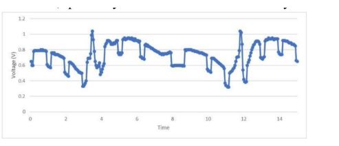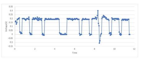 This misclassification becomes increasingly severe as the communication speed rises. For example, Figure 8 shows a 10 kbps waveform, while Figure 9 shows one at 2.5 kbps. In the presence of fluorescent lamp noise, more symbols fall within a single noise cycle at higher transmission rates, increasing the probability of detection errors. These observations indicate that the number of misclassifications grows proportionally with communication speed.