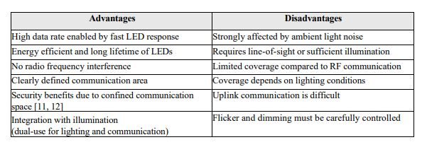 On the receiver side, photodiodes are widely used as detectors because their response time is faster than that of phototransistors. Since VLC employs light as the transmission carrier, ordinary illumination devices can also act as transmitters. Moreover, because communication is confined strictly to the illuminated area, the coverage of VLC is well- defined, in contrast to radio frequency (RF) communication, where the boundaries of the communication range are less distinct. This spatial confinement also provides security advantages, as eavesdropping from outside the illuminated area is inherently difficult [11, 12]. Table 1 summarizes the features of VLC.