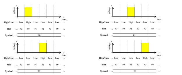 As depicted in Figure 3, I-PPM encodes binary information by shifting the position of the LOW state within a fixed number of slots. While conventional PPM which uses the HIGH state as the information carrier, I-PPM instead assigns information based on the LOW state. Figure 3 shows an example with four slots. Like PPM, I-PPM maintains a constant duty ratio and thus voids flicker, making it well-suited for VLC.