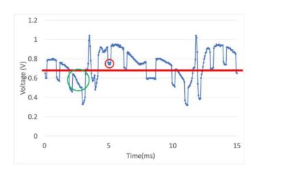 In VLC receivers, HIGH and LOW states are determined relative to a threshold voltage. In Figure 7 illustrates an example in which the threshold (red line) is set near the center of the signal shown in Figure 6. As indicated, the segment marked with a red circle should represent a LOW signal, but noise raisesit above the threshold, leading to a false HIGH detection. Conversely, the segment