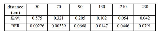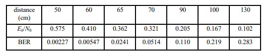 The hardware setup described in Section 4.2 is used without modification. The communication distance is varied in order to change the received signal strength, and BER is measured at each distance. As an indicator of signal strength, we employ the energy-per-bit to noise density ratio (Eb/N0).