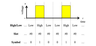 As shown in Figure 1, OOK transmits binary data by assigning the HIGH state to “1” and the LOW state to “0” (yellow indicates HIGH and white indicates LOW in the figure). OOK is the