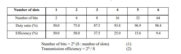 The relationship between the number of bits and the number of slots in I-PPM is expressed in Eq. (1), and the corresponding transmission efficiency is given in Eq. (2). The calculated values are summarized in and illustrated in Figure 4.