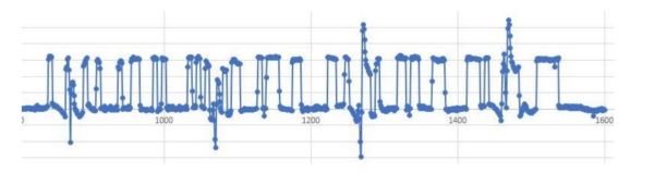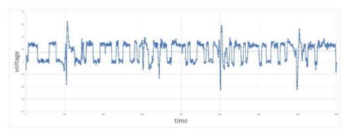 This misclassification becomes increasingly severe as the communication speed rises. For example, Figure 8 shows a 10 kbps waveform, while Figure 9 shows one at 2.5 kbps. In the presence of fluorescent lamp noise, more symbols fall within a single noise cycle at higher transmission rates, increasing the probability of detection errors. These observations indicate that the number of misclassifications grows proportionally with communication speed.