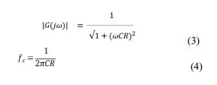 pass filter and is commonly used in devices such as digital cameras. A first-order RC low-pass filter, consisting of a resistor and a capacitor, exhibits the gain shown in Eq. (3), where 𝜔 denotes angular frequency. The cutoff frequency fc is given by Eq. (4).
