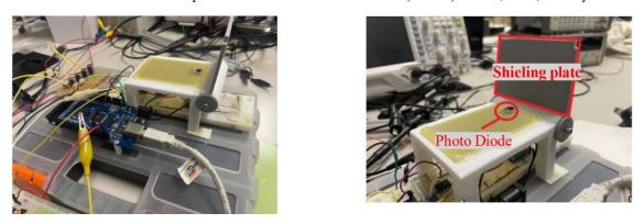 It can be observed that the blue waveform still contains a small portion of the signal, indicating that part of the original signal is attenuated. This effect is likely caused by light penetration through the shielding plate, which is fabricated from PLA filament using a 3D printer. Another possible factor is reflection of the signal light from surrounding walls not covered by the shielding plate. In this paper, however, we do not further investigate this issue, since the output waveform after subtraction still approximated a rectangular signal. Additionally, small overshoots are observed in the subtracted waveform, particularly in the high-frequency components. This is attributed to sensitivity differences between the two photodiodes.
