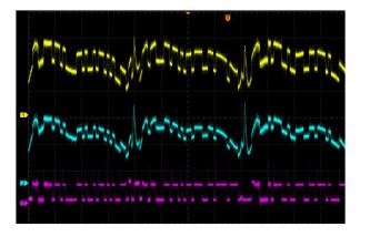 The experimental environment included fluorescent lamp noise, as described in Section 3, producing a waveform similar to that shown in Figure 5. An example of the obtained waveforms is presented in Figure 22. In this figure, the yellow waveform corresponds to the signal photodiode output, the blue waveform corresponds to the noise photodiode output, and the purple waveform represents the result after subtraction by the noise cancellation circuit.