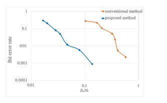 From the results, it can be observed that the influence of interference becomes significant when Eb/N0 falls below 0.5. At these measurement points, the proposed method achieved better performance than the conventional method.