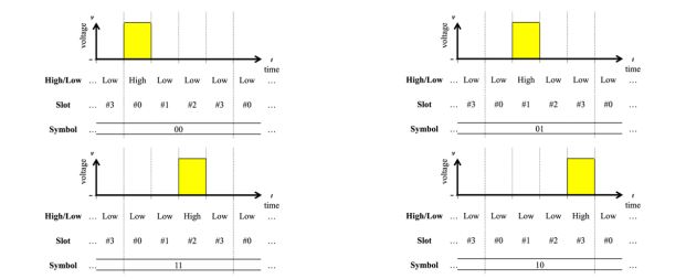 As depicted in Figure 3, I-PPM encodes binary information by shifting the position of the LOW state within a fixed number of slots. While conventional PPM which uses the HIGH state as the information carrier, I-PPM instead assigns information based on the LOW state. Figure 3 shows an example with four slots. Like PPM, I-PPM maintains a constant duty ratio and thus voids flicker, making it well-suited for VLC.