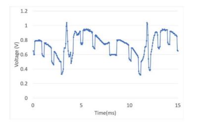 In digital VLC, light sources other than the intended transmitter act as interference. A typical example is fluorescent lighting, which produces distorted noise waveforms, as illustrated in Figure 5. When such noise is superimposed on a digital VLC signal, the received waveform becomes distorted, as illustrated in Figure 6. The origin of this distortion lies in the rectification process of alternating current (AC) power, which is examined in the next subsection