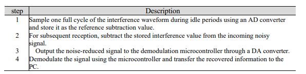 At the receiver, both the interference signal and the received VLC signal are sampled as analog values through an analog-to-digital (AD) converter. One cycle of the periodic interference waveform is then subtracted from the received signal waveform. The resulting noise-reduced signal is converted back into analog form using a digital-to-analog (DA) converter and passed to the demodulation microcontroller, which recovers the transmitted information. During the sampling process, the interval is set to capture five points per slot of the received VLC signal. This design prevents the distortion that would occur if the sharp edges of rectangular waveforms are sampled directly. The procedure of the proposed method is summarized in Table 3.