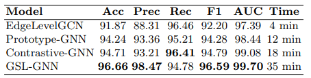– Best accuracy: GSL-GNN (96.66%, 35 min training)