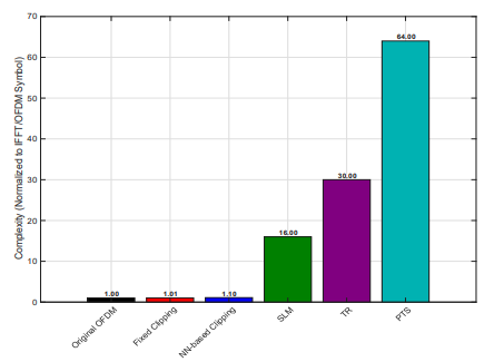As observed from Figure 5, the proposed ANN-Clipping method introduces only a marginal computational overhead of approximately 10% compared to conventional OFDM, while significantly outperforming probabilistic techniques such as SLM and PTS, whose complexity increases exponentially with the number of candidate sequences or phase combinations.