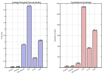 The results in figure 6 further illustrate the efficiency of the proposed method. Although slightly more demanding than fixed clipping, remains two to three times faster than the complex probabilistic techniques (SLM and PTS) and performs within real-time processing constraints. Its computational cost of 76.6 kOps is orders of magnitude lower than that of PTS (1130.5 kOps) or TR (691.2 kOps) in our setup, confirming its suitability for low-power hardware implementations.