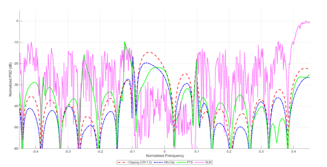 The PTS method and SLM maintain superior spectral confinement comparable to the original OFDM signal, with OOB emissions suppressed below −30 dB, confirming the absence of spectral distortion despite their higher computational complexity. The proposed NN-Clipping method achieves a remarkable balance between spectral efficiency and PAPR-reduction performance, with OOB emissions remaining roughly 10–15 dB lower than those of fixed clipping across the entire frequency spectrum, thereby approaching the spectral-confinement characteristics of distortionless methods. This substantial improvement is attributed to the ANN-based adaptive threshold mechanism, which minimizes clipping-induced distortion by leveraging the signal’s instantaneous statistics, establishing ANN-Clipping as a practical solution for next-generation wireless systems where both spectral and energy efficiency are critical design constraints.