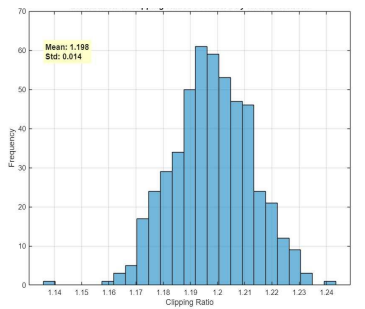 To better understand the adaptive behavior of the proposed network, the distribution of clipping ratios (CR) predicted for 10,000 OFDM symbols is shown in Figure 8. The predicted CRs follow an approximately Gaussian distribution centered around 1.198 with a very low standard deviation (0.014), indicating a stable and coherent decision process. The neural network thus identifies an optimal region around CR ≈ 1.2, balancing PAPR reduction and distortion minimization. The slight asymmetry of the histogram shows that the model occasionally adapts the CR toward lower values (1.14) for symbols with naturally lower peaks and higher values (1.24) for critical peak cases, confirming its dynamic response to instantaneous signal characteristics.