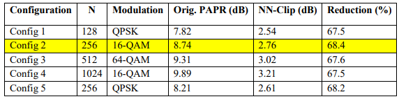 Tests conducted over various frame sizes (N = 128–1024) and modulation schemes (QPSK, 16- QAM, 64-QAM) confirm the robustness and generalization capability of the proposed method. As shown in Table 5, the average PAPR gains achieved by NN-Clipping remain between 67% and 69% relative to the original OFDM, demonstrating consistent performance without retraining.