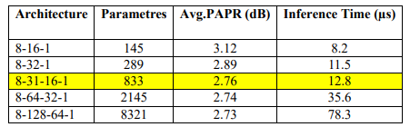 Several network topologies were evaluated in terms of parameter count, achieved PAPR, and inference time. The results in Table 6 show that the 8–32–16–1 architecture offers an excellent trade-off between accuracy, latency, and complexity.