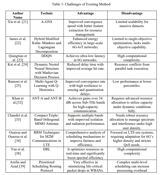 Some of the recent works related to this research study area are described as follows, Recent works deal with the issues of 6G resource management. Xia et al. [21] proposed an Attentionbased Graph Neural structure (A-GNS) based on power received and signal strength, which attained a better convergence, but low scalability. A dynamic resource model suggesting the modification of KuhnMunkres algorithm and Lagrangian decomposition to achieve energy efficiency in 6G-IoT networks was proposed by James et al. [22], but has been applied to multiobjective problems. Quingtian et al. [23] applied a double deep Q network (DDQN) with the highest complexity but with ultra-low latency [23] through optimal resource allocation. The Markovian decision process and dynamic nested neural structure designed by Kai et al. [24] minimized the delay time but had resource conflicts during the simultaneous execution of these tasks. Ramoni et al. [25] proposed the concept of multi-agent Q learning, Q-heuristics channel and power selection that enhanced convergences but had low percentiles. Khan et al. [32] came up with high-gain metamaterial-based antennas with an additional gain of over 34 dBi in SubTHz frequencies. Chandel et al. [33] proposed small-scale triple-band orthogonal MIMO antennas to operate in the C band, Wi-Fi 6E and X bands. Ouaissa and Ouaissa et al. [34] considered the radio resource management of M2M communications revealing the congestion in radio resources and computational complexities of scheduling algorithms in dense environments. Yan et al. [38] proposes a dynamic resource allocation framework for 5G network slicing using DRL. By integrating an Advantage Actor-Critic (A2C) algorithm with Massive MIMO technology, the system autonomously manages bandwidth and power across different network slices. Arefin and Azad [39] introduce a Prioritized Scheduling Routing Protocol for Wireless Body Area Networks (WBANs) to enhance medical data reliability. The protocol categorizes sensor data based on urgency, ensuring that critical health alerts are prioritized during transmission to prevent packet drops and reduce latency. Table 1 provides the difficulties of the available literature.