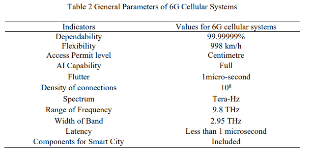 6G cellular systems function in the frequency range of 101 GHz to 3 THz, enabling ultra-highspeed data transmission and extremely low latency for next-generation communication networks. However, managing massive data remains challenging. As 6G focuses on highquality service and terabit wireless performance, standardization efforts for terahertz communication are still in their early stages. The formally accepted 300 GHz band supports numerous encoding modules. General Parameters of 6G Cellular Systems Shown in Table 2.