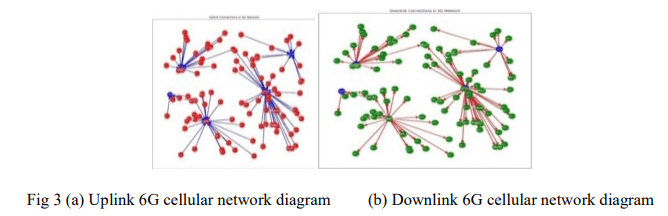 The 6G cellular environment developed in the NS3 stimulator in uplink and downlink is shown in Fig 3. In the uplink Fig 3 (a), data flows from the red circles (users) to the blue circle (station). This represents the transmission of data from user devices to the network infrastructure. The performance metrics measured (throughput, transfer rate, energy usage, packet loss, and delay) would directly impact the uplink performance. For example, a high uplink throughput would indicate efficient transmission of data from users to the network. In the downlink Fig 3 (b), data flows from the blue circle (station) to the red circles (users). This refers to data transmission from the network to user devices. Key metrics like low packet loss indicate reliable and efficient downlink performance.