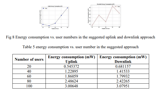 With the growth in the capacity of the data, the energy consumption also rises. Energy efficiency is an important issue in 6G networks due to the fact that the increased speed and transmissions will be accompanied by high power consumption since the high-speed performance will require too much power. Fig 8 and Table 5 indicate that with increase in the number of users, uplink energy consumption also increases, as compared to 0.545mW at 20 users, 3.006mW at 100 users and downlink energy consumption also increases, compared to 0.681mW at 20 users and 3.079mW at 100users. It means that as the data traffic increases, the energy consumption increases at the same proportion.