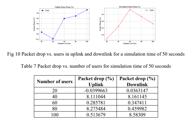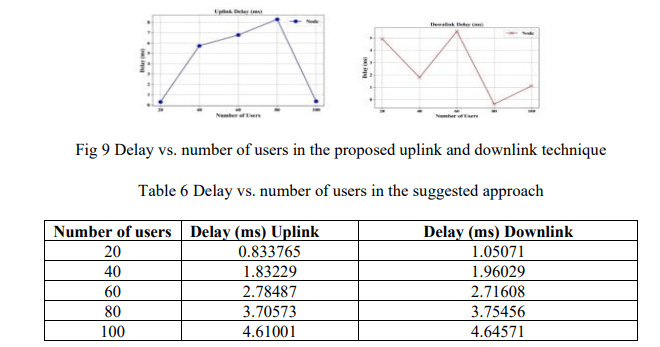 The delay in communication between the processing of data packets in the protocol stack and their delivery at the receiving layer of the target layer affects quality of service and the user experience. As seen in Fig 9 and Table 6, uplink delay increases to 4.610 and downlink to 1.050 ms as the number of users (20 to 100) increase respectively. The increasing trend of latency at the higher user loads underscores that it is difficult to sustain low delay at high traffic.