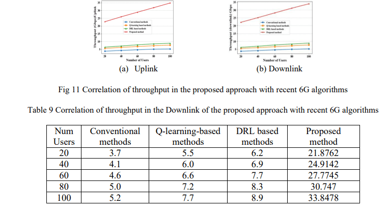 Figure 11 and Tables 8-9 provide the throughput performance comparisons. The proposed method is much more effective than the existing 6G approaches, such as Conventional (3.852 users), Q-learning (5.67 users) and DRL (6.48 users), whose throughput was 22.779134.8037users, respectively. This shows the outstanding scalability and efficiency of the proposed model in comparison to existing methods.