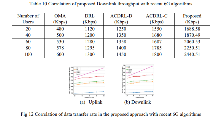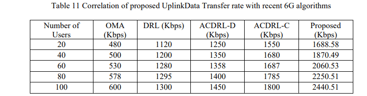 Data Transfer Rate is used to quantify the rate of information transfers within the network elements. As Figure 12 (a) and Table 10 reveal, the proposed downlink method is more efficient in maximizing the rate of downlink, with the rate of 2440.52 being significantly higher than the existing approaches to 6G, including OMA (600), DRL (1300), actor-critic deep reinforcement learning- discrete action (ACDRL-D) [27] (1450), and actor-critic deep reinforcement learningcontinuous action (ACDRL-C) [27] (1800), and demonstrates a better ability to maximize the efficiency of the downlink. Table 11 in the comparison of uplink data transfer rates shows that there are considerable improvements. OMA reaches 600, DRL reaches 1300, ACDRL-D reaches 1450 and ACDRL-C reaches 1800. The presented approach provides the highest value of 2440.47 as it is depicted in Figure 12 (b) and is mostly superior to all the other methods in maximizing the uplink data transfer rates.