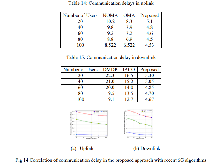 The suggested downlink is contrasted with Deep Markov Decision Process (DMDP) and the Improved Ant Colony Optimization (IACO) [30]. Table 14 of Non-Orthogonal Multiple Access and Orthogonal Multiple Access Finite Block length theorem (FBT) [31] compares the proposed approach in uplink with the existing approaches. Table 15 records these readings. Figure 14 (a) demonstrates the correlation of communication delay in the suggested approach with the recent 6G algorithms. Table 14 gives the values of values of communication delay in the downlink. The comparison of the results reveals that the given approach decreases the downlink communication delay to 4.67 milliseconds (ms) (Figure 14, b), which is significantly lower than the delay to 19.1 milliseconds (Delays Minimization Dynamic Programming, DMDP) and 12.7 milliseconds (Iterative Ant Colony Optimization, IACO). This shows that it is more efficient in reducing delay.