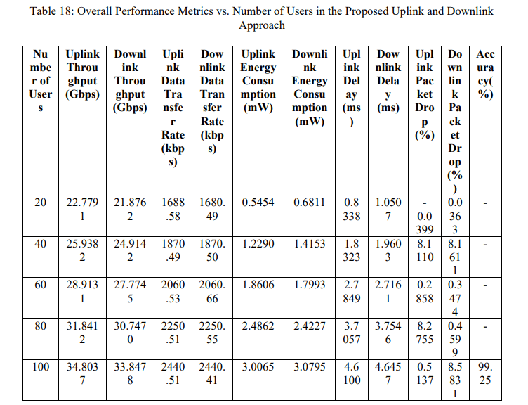The summary of Comprehensive Performance Evaluation can be seen in Table 18 which provides a detailed overview of the uplink and downlink performance of the proposed system, in 20-100 users, through throughput, data rate, energy consumed, delay, packet drop, and accuracy. The findings indicate scalable throughput and data rates, and energy consumption and delay increase with heavier loads, and there is also varied packet drop with conditions of the network. The suggested HLEVRA framework has a high accuracy of 99.25 which proves its high efficiency in 6G conditions.