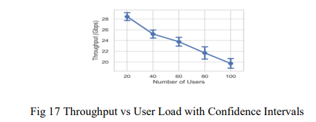 To assess the statistical soundness of HLEVRA under different network loads, we performed a one-way ANOVA test on the throughput measurements inductive on the results in five different user situations (20, 40, 60, 80 and 100 users), and 10 randomized experiments. The ANOVA showed a large F-value of 143.31 and p-value of 5.44 × 10 -5, which is statistically significant difference in throughput performance of the load conditions. Figure 17 provides a correlation between throughput and user load by the 95 percent confidence interval. On increasing the number of users, the average throughput tends to reduce slowly as the number of users rises to 100 since there is increased network contention. The error bars ensure that there is stable and reliable performance, and the robustness of HLEVRA and its stability in different load conditions can be determined.