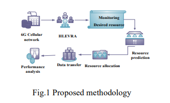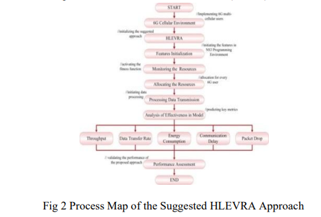 Fig 2 illustrates the HLEVRA process. The 6G cellular environment is implemented in NS3 simulator, and HLEVRA is activated to optimize data transmission. Optimization identifies network resource requirements, allocates resource tasks to specific functions, and processes data transmission. Performance is evaluated through energy consumption, communication delay, packet drop, data transfer rate, and throughput. Results are compared with recent techniques for validation.