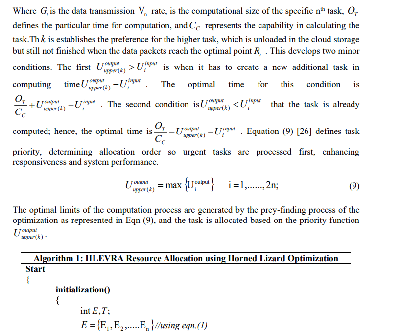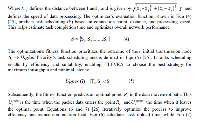 Afterwards, the optimization’s fitness function is triggered to determine the duration of data processing in each connection with their tasks ( Ft ). And is denoed in Eqn (3) [23].This is used to calculate processing time, helping HLEVRA allocate resources efficiently and reduce latency.