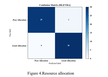 This confusion matrix illustrates the classification performance of the proposed HLEVRA model for resource allocation decisions. The matrix shows that the model correctly classified 29 instances of Poor Allocation and 30 instances of Good Allocation, demonstrating strong prediction reliability. Only one case of Poor Allocation was misclassified as Good Allocation, and there were no misclassifications in the Good Allocation category. The high number of correct predictions and minimal error indicate that the model effectively distinguishes between poor and good allocation decisions with high accuracy and strong generalization capability. Resource allocation Shown in Figure 4