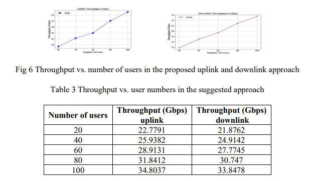 Multi-input, multi-output approach ensures that there is stability of the data transfer rate in the 6G system. Fig 7 indicates the rate at which a user is able to transfer data when there is an increasing number of users in the proposed uplink and downlink system. Table 4 indicates that uplink and downlink rates increase (1688.58kbs to 2440.51kbs and 1680.49 to 2440.41 kbps respectively) with the number of users rising between 20 and 100. This proves effective scaling and balanced performance during management of increased traffic.