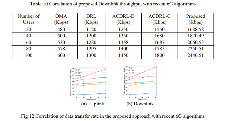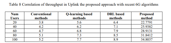 Figure 11 and Tables 8-9 provide the throughput performance comparisons. The proposed method is much more effective than the existing 6G approaches, such as Conventional (3.852 users), Q-learning (5.67 users) and DRL (6.48 users), whose throughput was 22.779134.8037users, respectively. This shows the outstanding scalability and efficiency of the proposed model in comparison to existing methods.