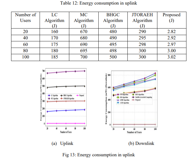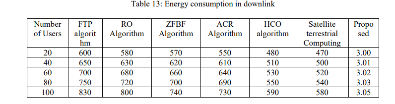 Energy Efficiency Analysis gives a comparison between the proposed approach and recent 6G models in Table 12, Table 13, and Figure 13. The uplink proposed is compared with Local computing (LC), MEC server computing (MC) algorithm, based on Hungarian and graph colouring (BHGC), and Joint task offloading and resource allocation in mobile edge computing with energy harvesting [28]. In the uplink, the suggested approach uses 3.02 mW, which is way less than LC (185 mW), MC (700 mW), BHGC (500 mW), and JTORAEH (300 mW), and it represents an unprecedented power optimization. In the case of the downlink, compared with Fixed Transmit Power (FTP) Algorithm, Zero-Forcing Beamforming (ZFBF) Algorithm, Random Offloading (RO) Algorithm, Average Computing Resources (ACR) Algorithm, and Heuristic Computing Offloading (HCO) Algorithm [29]. It has a 3.07 mW, which is better than FTP (830 mW), RO (800 mW), ZFBF (740 mW), ACR (730 mW), HCO (590 mW), and Satellite Terrestrial Computing (580 mW). The resulting extreme change underscores the high energy efficiency by the proposed model in the uplink and downlink communication
