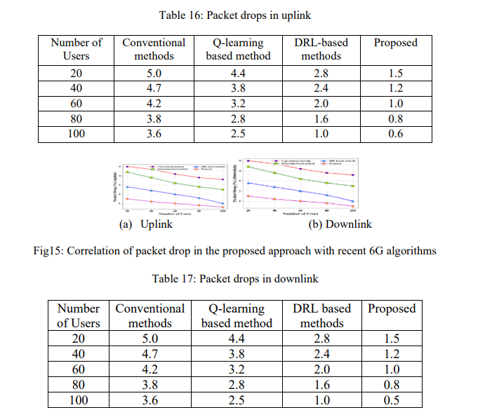 Table 16, Table 17, and Figures 15 show Packet Drop Analysis of uplink and downlink. Compared to Conventional (3.6%), Q-learning (2.5%), and DRL (1%), the proposed method has the lowest percentage (0.6) in the uplink and downlink, which is minimized to minimum loss. This is a huge decrease made possible by the effectiveness of the proposed model in reducing the number of packets lost and increase the reliability of transmissions.