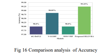 Traditional approaches such as the 6G Distributed Hash Table and Blockchain-enabled Federated Learning for IoT (6G-DeFLI) [35], Enhanced Congestion Avoidance Model with V Gradient Geocast Routing Protocol (V-GGRP) [36] and the Intelligent Osprey Optimized Versatile Random Forest (IOO-VRF) model [37] are used for comparison. In 6G-enabled IoT networks, HLEVRA performs better with 99. 25 per cent accuracy compared to 6G-DeFLI (98), V- GGRP (98. 85), and IOO-VRF (98) (as indicated in Figure 16). It was also found to be robust, scalable, and efficient in 6G resource allocation using NS3 simulations of up to 20100 users, with up to 45x higher throughput, and one hundred ninety percent lower energy consumption and delay and packet drop than Conventional, Q-learning, DRL, and Actor-Critic models.