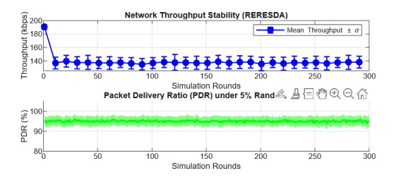 Figure 11 shows how stable the RERESDA scheme’s performance is over 300 rounds of simulation. After a brief period of convergence, the network throughput settles down to a mean value that stays almost the same, with very little variation. This means that there are very few changes during steady operation. The packet delivery ratio stays between 93% and 95% most of the time, with only small changes, even when the randomness is less than 5%. In general, the results show that RERESDA keeps throughput stable and packet delivery reliable, even when the network is acting up randomly.