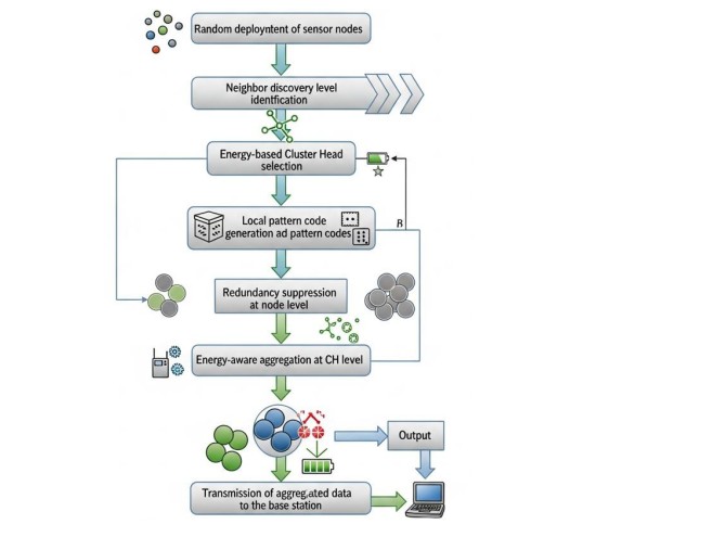 This section presents the proposed methodology for energy-efficient and redundancy-aware data aggregation in Wireless Sensor Networks (WSNs). The framework combines hierarchical clustering, pattern-code–based redundancy suppression, and energy-aware data forwarding to minimize unnecessary transmissions and prolong network lifetime.