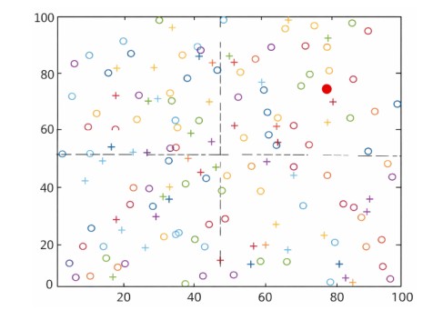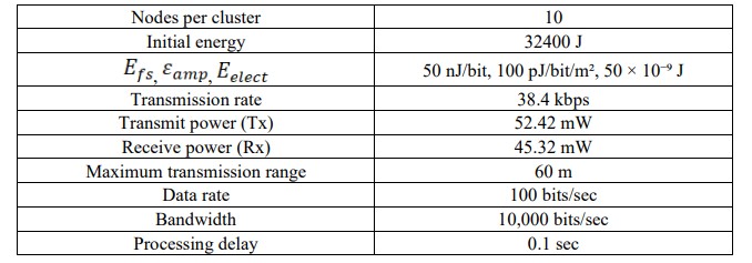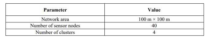There are 40 sensor nodes randomly spread out across the 100m×100m sensing field, and they stay in one place (not moving) during simulations. The Base Station (BS) is in the middle of the sensing field and is the last place to gather information. We use MATLAB to run all the tests so that we can control them and repeat them. This simulation is used to test the proposed algorithm’s energy and bandwidth and to see how it works compared to a protocol that doesn’t use aggregation. Figure 4 shows how the network was set up, and table 1 lists the radio and network settings used in the simulation.